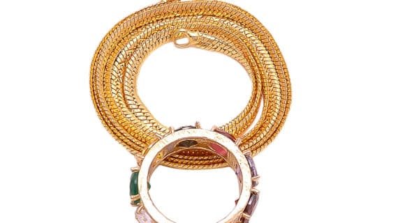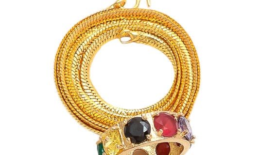 - Navratana Ring Pendant is made up of Pure Brass (Panchdhatu) and with nine gemstones which are stabbed in the ring of this Pendent, plated in gold looks very spiritual and Religious.