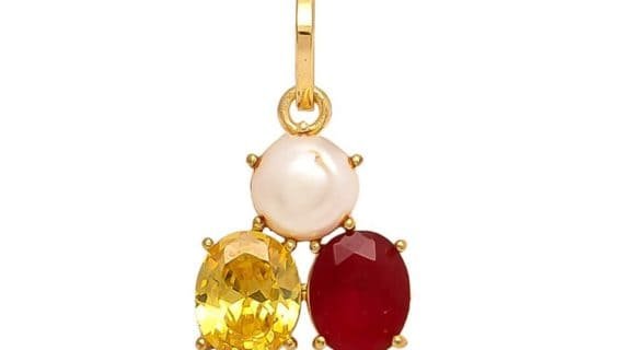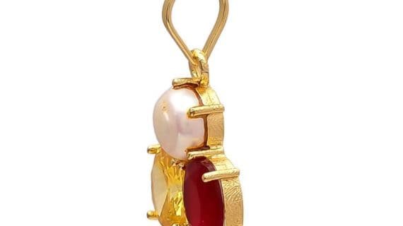 This pendant made of pure brass panchdhatu and with 3 gemstones i.e. Yellow Sapphire, pearl, and Ruby, plated in gold looks very beautiful and Elegant.