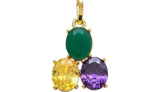 - This pendant made of pure brass panchdhatu and with 3 gemstones i.e. Blue Sapphire, Yellow Sapphire, and Emerald plated in gold looks very beautiful and Elegant.