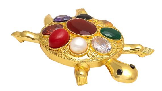 - Tortoise décor piece is made up of Pure Brass (Panchdhatu) and synethic 9 Gemstone which are properly stubbed in its shell. plated in Gold looks very Elegant and Beautiful.