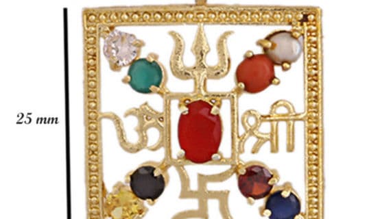 - Navratna 4 symbol Pendant in the shape of a square is made up of Pure Brass (Panchdhatu) and with 9 gemstones which are properly stubbed all around in this pendent and with ruby and 4 symbols stubbed in this pendant, plated in gold looks very Religious and Spiritual.