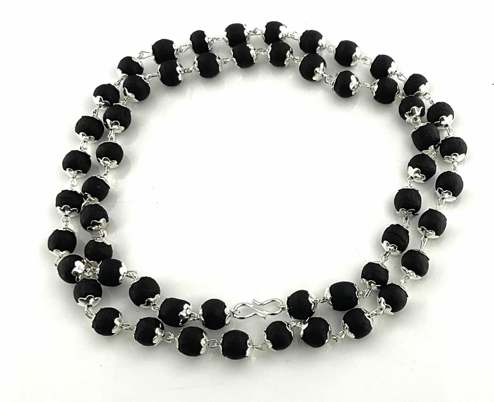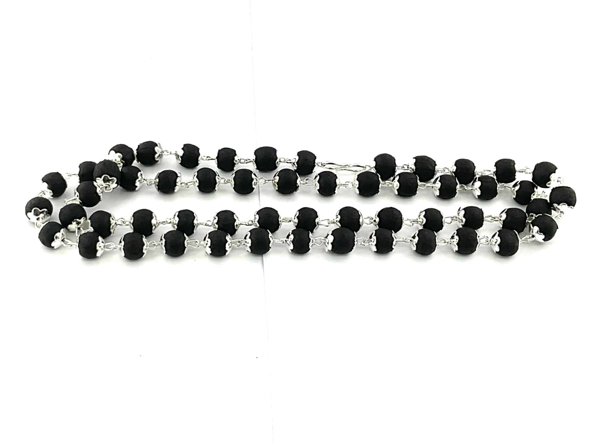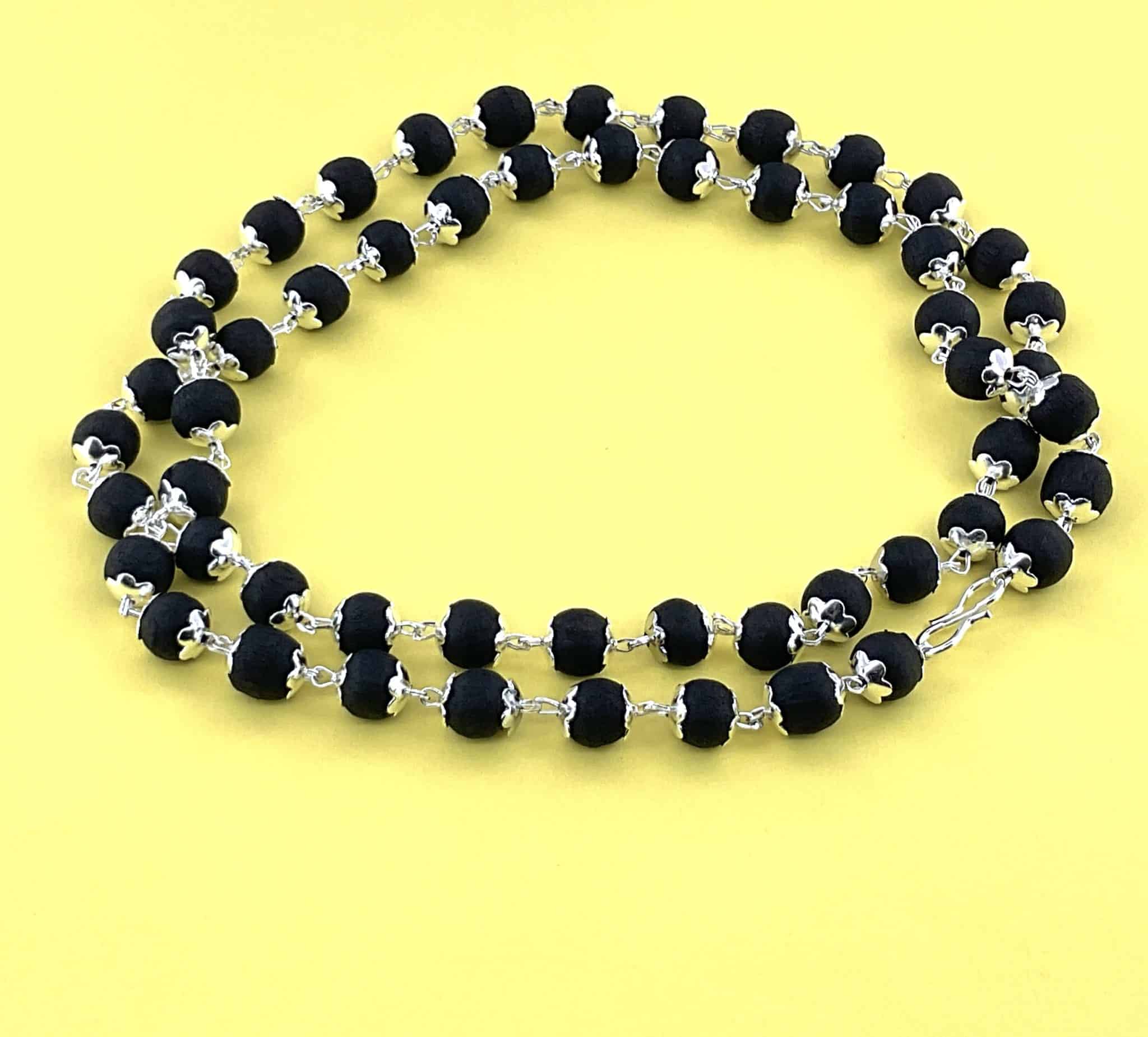 Natural Karungali mala with elegant silver coating, crafted from eco-friendly sacred wood known for grounding energy and spiritual benefits. Ideal for meditation, spiritual practices, and daily wear. Lightweight, durable, and suitable for men and women.