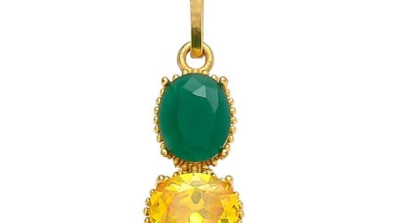 - This pendant is made of pure brass panchdhatu and with 2 gemstones. yellow Sapphire and Emerald plated in gold look very beautiful and Elegant.