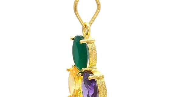 शुद्ध पीतल के पंचधातु से बना यह पेंडेंट और 3 रत्न यानी ब्लू नीलम, पीले रंग के नीलम और एमराल्ड के साथ सोने में चढ़ाया हुआ बहुत सुंदर और सुरुचिपूर्ण दिखता है।